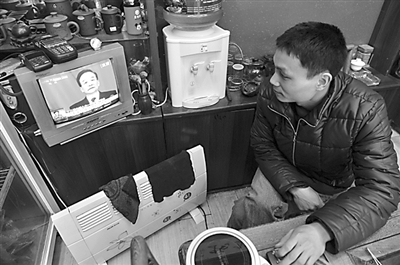 3月5日,西安市建西街的一家茶叶店内,林泓锟通过电视收看十二届全国人大一次会议开幕会直播。林泓锟说,自己很关心两会,希望从总理的工作报告中找到信心。