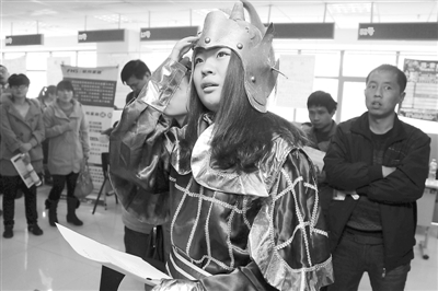 3月5日,河南省郑州市二马路劳务市场举行女子专场招聘会。黄河科技学院的学生肖可颜一身花木兰打扮找工作,呼吁招聘企业要男女同等对待,给女子和男性同等的就业机会。