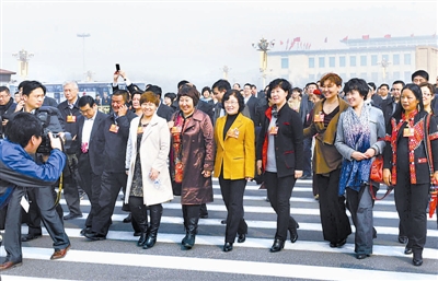 3月7日,全国政协十二届一次会议举行第二次全体会议。入场时,走在最前面的女委员备受媒体的关注。次日,她们将迎来“三八”国际劳动妇女节。本报记者 许之丰 摄