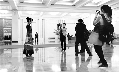 3月7日,是全国两会集中审议和讨论政府工作报告的时间,女性代表、委员在紧张忙碌中迎来自己的节日——“三八”国际劳动妇女节。图为少数民族代表身着盛装在人民大会堂拍照留念。