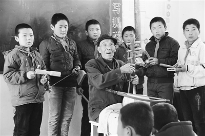 3月5日,在甘肃省环县洪德乡三十里铺小学的教室里,73岁的民间艺人胡正明给学生上皮影课。环县道情皮影艺术闻名海内外,为了让这项非物质文化遗产得到传承,近年来,10多名民间艺人义务在中学开设皮影课,让孩子逐渐喜欢上这一民间文化。