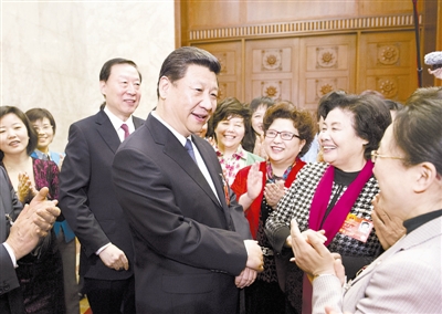 3月8日,中共中央总书记、中共中央军委主席习近平参加十二届全国人大一次会议江苏代表团的审议。这是习近平同女代表亲切交谈,并代表党中央向参加全国两会的女代表、女委员和全国各族妇女致以节日的祝福。 新华社记者 黄敬文 摄