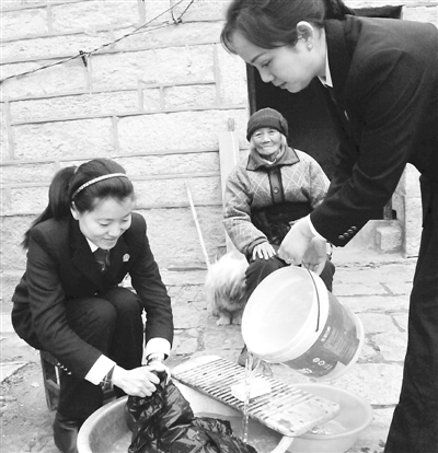 3月5日,江苏省连云港市连云区人民法院女法官带着鱼肉和蔬菜等食品到该区老君堂村89岁空巢老人徐秀珍家,为老人洗衣服、修指甲、陪老人聊天。据了解,该院干警们在实施“学雷锋工程”中,坚持常年学雷锋为民做好事、办实事已达5000多件,被群众亲切地称为:“守望精神高地的‘活雷锋’”。图为女法官在为老人洗衣服的情形。