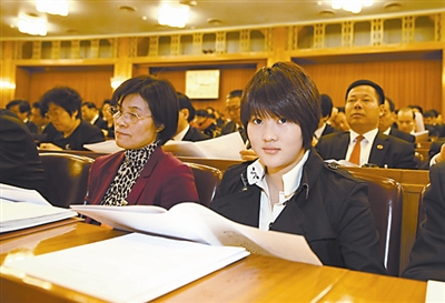 2013年3月5日,第十二届全国人民代表大会代表中年龄最小的陈若琳(前右)。20岁的陈若琳曾获得4枚奥运金牌和18个世界冠军。