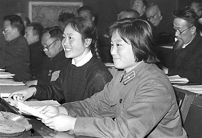 1964年12月30日,李淑兰(前右)在全国政协四届一次会议上。李淑兰是第四届和第六届全国政协委员。她曾先后17次打破8项射箭世界纪录。新华社发