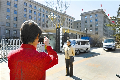 3月10日中午,得知铁道部被裁撤的消息后,一些北京市民和铁路职工来到铁道部门前留影(图二)。本报记者 于文国 摄