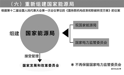 (六)重新组建国家能源局,完善能源监督管理体制。上一轮改革,为加强能源管理,组建了发展改革委管理的国家能源局,实际效果良好。为统筹推进能源发展和改革,加强能源监督管理,《方案》提出,将现国家能源局、电监会的职责整合,重新组建国家能源局。主要职责是,拟订并组织实施能源发展战略、规划和政策,研究提出能源体制改革建议,负责能源监督管理等。不再保留电监会。改革后,国家能源局继续由发展改革委管理。发展改革委主要是做好国民经济和社会发展规划与能源规划的协调衔接。