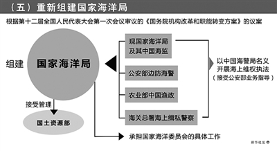 (五)重新组建国家海洋局,推进海上统一执法。现行海上执法力量分散,重复检查、重复建设问题突出,执法效能不高,维权能力不足。为加强海洋资源保护和合理利用,维护国家海洋权益,有必要整合海上执法力量。