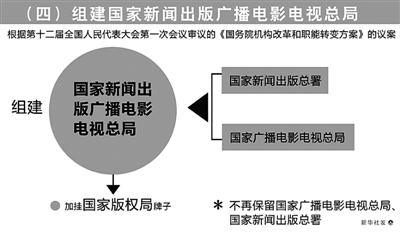 (四)组建国家新闻出版广播电影电视总局,促进新闻出版广播影视业繁荣发展。为进一步推进文化体制改革,统筹新闻出版广播影视资源,《方案》提出,将新闻出版总署、广电总局的职责整合,组建国家新闻出版广播电影电视总局。主要职责是,统筹规划新闻出版广播电影电视事业产业发展,监督管理新闻出版广播影视机构和业务以及出版物、广播影视节目的内容和质量,负责著作权管理等。国家新闻出版广播电影电视总局加挂国家版权局牌子。不再保留广电总局、新闻出版总署。
