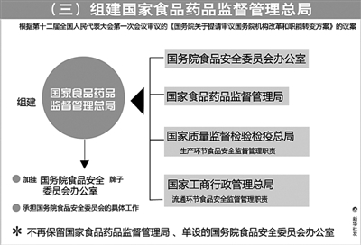 《方案》提出,将食品安全办的职责、食品药品监管局的职责、质检总局的生产环节食品安全监督管理职责、工商总局的流通环节食品安全监督管理职责整合,组建国家食品药品监督管理总局。主要职责是,对生产、流通、消费环节的食品安全和药品的安全性、有效性实施统一监督管理等。将工商行政管理、质量技术监督部门相应的食品安全监督管理队伍和检验检测机构划转食品药品监督管理部门。保留国务院食品安全委员会,具体工作由食品药品监管总局承担。食品药品监管总局加挂国务院食品安全委员会办公室牌子。不再保留食品药品监管局和单设的食品安全办。