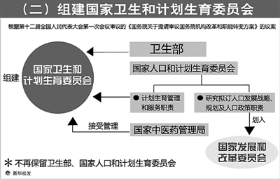 (二)组建国家卫生和计划生育委员会,提高出生人口素质和人民健康水平。我国实行计划生育以来,计划生育事业取得历史性成就,有效缓解了人口对资源环境的压力。近年来,医疗卫生事业取得显著成绩。当前,计划生育工作需要在继续稳定低生育水平基础上更加注重提高出生人口素质,医疗卫生服务水平也需要不断提高。为更好地坚持计划生育的基本国策,加强医疗卫生工作,深化医药卫生体制改革,优化配置医疗卫生和计划生育服务资源,提高出生人口素质和人民健康水平,《方案》提出,将卫生部的职责、人口计生委的计划生育管理和服务职责整合,组建国家卫生和计划生育委员会。主要职责是,统筹规划医疗卫生和计划生育服务资源配置,组织制定国家基本药物制度,拟订计划生育政策,监督管理公共卫生和医疗服务,负责计划生育管理和服务工作等。同时,将人口计生委的研究拟订人口发展战略、规划及人口政策职责划入发展改革委。国家中医药管理局由国家卫生和计划生育委员会管理。不再保留卫生部、人口计生委。