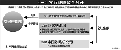 (一)实行铁路政企分开,完善综合交通运输体系。近些年,铁路实现了跨越式发展,保障了国民经济平稳运行和人民生产生活需要,但也存在政企不分、与其他交通运输方式衔接不畅等问题。为推动铁路建设和运营健康可持续发展,保障铁路运营秩序和安全,充分发挥各种交通运输方式的整体优势和组合效率,有必要实行铁路政企分开,加快推进综合交通运输体系建设。