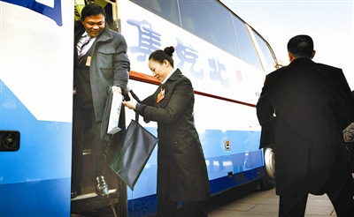 3月10日上午,十二届全国人大一次会议举行第三次全体大会,浙江团的车队到达人民大会堂前后,全国五一劳动奖章获得者王月英代表都会习惯性地首先跳下车,站在车门口帮助每一位下车代表。