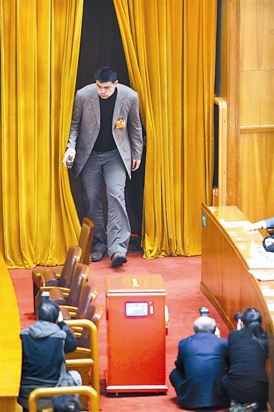 3月11日下午,全国政协十二届一次会议举行第四次全体会议。休息时,全国政协委员姚明为了不打扰其他委员,从边门轻步入场。