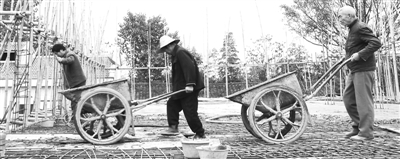 年近七旬的李德华老人(右)正在湖北省安陆市星火小学教学楼建筑工地推斗车。