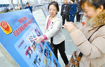 3月14日,在邯郸市新世纪广场,消费者拍下仿冒产品鉴定信息为以后购物作参考。
