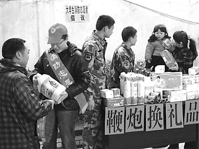 河南南阳师范学院学生江雨佳(右一),是浙江省台州市温岭人。今年寒假,她在浙江省玉环县消防大队参与社会实践期间,想出了“鞭炮换礼品”,不让居民因怕“浪费”而不得不燃放掉剩余烟花的办法。她用自己的700元压岁钱作起动资金,购买了纸巾、垃圾袋、纸杯等日常生活用品。她的做法受到群众的热烈欢迎。金永建 摄