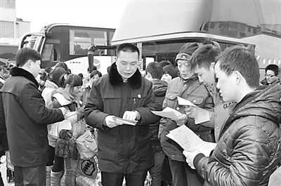 连日来,外出务工人员出现集中返城现象。为了使务工人员更好地维护自己的权益,河南太康县法院的法官们轮流前往长途车站为务工人员提供法律服务。图为法官向务工人员发放《外出务工维权手册》和《诉讼指南》等资料的情形。