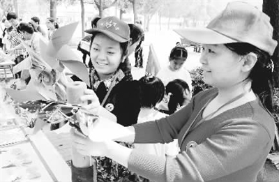 图中年轻姑娘,是中石化巴陵石化的班组职工,她们手里的风车是用废纸广告纸做成的。3月9日上午,她们利用周末休息时间,与湖南岳阳市科普环保志愿者协会的30多名同样来自班组的志愿者一起,来到鹰山社区开展“科普环保进社区”活动,通过环保宣传、旧物改造、旧书废报换绿色礼物、赠送环保购物袋、招募科普环保志愿者等方式,倡导绿色低碳生活。彭展 摄