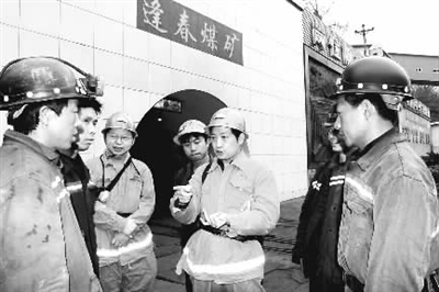 “张矿长,你规定的不会背‘七条规定’不许下井呦,你背得到不?”3月13日上午,重庆能源集团逢春煤矿矿长张和栋带队下井工作时,被掘进2队员工胡世友(左一)拦在了井口。安监总局“矿长保护矿工生命安全七条规定”出台后,该矿要求全矿员工都要熟悉了解,副队长以上管理人员还要熟记背诵,凡不能背诵的一次处罚500元外,还不许下井。面对员工的追问,张和栋扳着手指流畅地背完了“铁七条”:“我不光是记得清楚,还要严格执行,让大家都平平安安地下井、出井。” 张登泽 摄