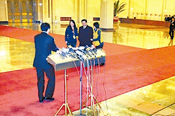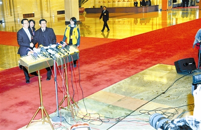 ①3月16日下午,十二届全国人大一次会议举行第六次全体会议。人民大会堂北门通道,记者“长枪短炮”严守这条“部长通道”。农业部部长韩长赋被“拉”到了“发言台”前,回答有关生猪定点屠宰的监管工作等问题。