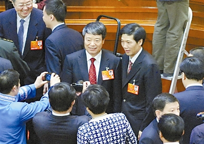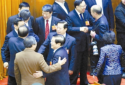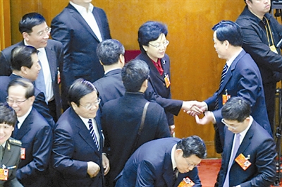 3月16日下午,十二届全国人大一次会议举行第六次全体会议,决定国务院副总理、国务委员、各部部长、各委员会主任、中国人民银行行长、审计长、秘书长的人选,表决第十二届全国人民代表大会各专门委员会主任委员、副主任委员、委员名单草案。全体代表票决结果公布后,两会部长席上部长们相互致意。