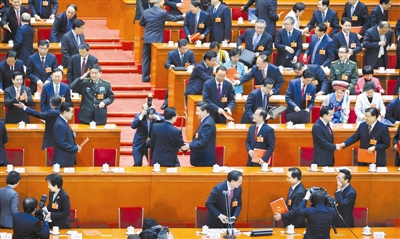 3月17日上午,十二届全国人大一次会议在完成了各项议程之后在人民大会堂胜利闭幕。闭幕后的人民大会堂主席台上,代表们相互致意。