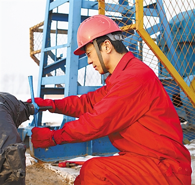 白雪皑皑的沃野,蓝色的抽油机,一身红色工装的采油工——走近臧鑫赫,就像在走进一幅重彩油画。