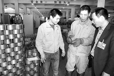许忠明(右)是来自浙江省长盛滑动轴承有限有公司的十二届全国人大代表,此次人代会上,他带去了关于进一步优化民营企业发展环境的建议。3月18日,许忠明回到企业后第一时间向工友传达全国人代会精神。