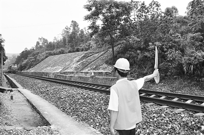 这位可不是来桂林旅游的观光客,他叫董杰胜,今年56岁,是桂林工务段的一名危石看守工。