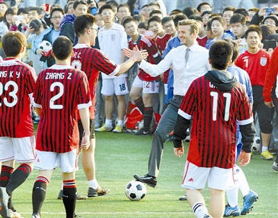 当日,刚刚被中国足协、中超联赛正式聘请为中国青少年足球发展及中超联赛推广大使的英国足球明星贝克汉姆,来到北京市第二中学,推广校园足球。