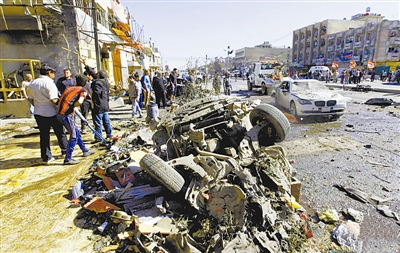 3月19日,在伊拉克战争爆发10周年纪念日前夕,伊拉克首都巴格达的什叶派穆斯林聚居区发生至少7起汽车炸弹爆炸和2起枪击事件,目前死亡人数已经升至56人,另有200人受伤。图为巴格达市区,民众聚集在一起汽车炸弹爆炸现场。吉平 供图