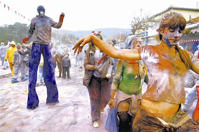 3月18日,希腊港口城市加拉克西季,狂欢者们在街头庆祝传统的“粉末星期一”,进行五彩缤纷的“粉末大战”。阿健 供图