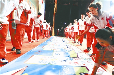 3月16日,北方交通大学附属中学举办初三年级“让梦想腾飞”的励志活动,着力提高学生的综合素质,让学生在成长中体验快乐。图为在活动的最后一个环节,初三学生都上台亮相,郑重按下他们的手印,希望在减负的号令下,素质教育能够稳住阵脚,坦然自若地前行。李超 摄