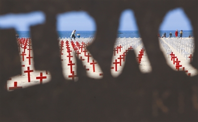 题图:这是2012年4月16日透过“伊拉克”字样的反战标牌拍摄的美国“西阿灵顿公墓”。新华社记者 刘宇 摄