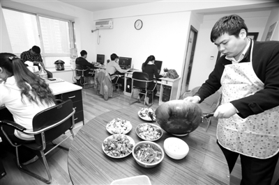 3月21日中午,在西安高新区一家网络公司,公司员工王怡在办公室给大家炒菜。王怡说,他们是小公司,只有10个员工,一到中午就为吃饭发愁,不仅时间紧而且附近吃饭的地方也比较少。从3月5日他们开始分工买菜、洗菜、炒菜、洗碗,坚持了一周,效果不错,就开始排值班表,让每个人都秀秀自己做饭的手艺,所有的费用都是公司掏钱。袁琛 摄