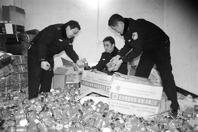 自2013年全国公安机关组织开展打假专项行动以来,河南上蔡县公安局以打击侵犯知识产权、假冒伪劣商品的犯罪案件为重点,严厉打击制假、售假行为。日前,上蔡县公安局接到举报,迅速出击,成功捣毁了一个生产假“加多宝”凉茶的特大窝点。图为民警在查获现场收缴假冒产品的场景。