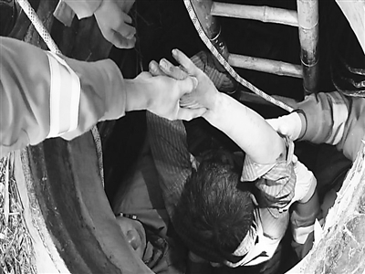 3月20日晨7时许,河南南阳联通公司的管线施工人员到市高新区检修线路,当他们打开通信窨井盖准备下井作业时,突然发现一名男子躺在窨井底部,几名施工人员朝井里连续呼喊得不到回音。南阳市消防大队接警后,迅速组织7名官兵救援,经过一个多小时的努力,终将其救出来。原来这名流浪人员图暖和钻入井内,险些窒息死亡。图为消防人员救助流浪人员出井时的情形。