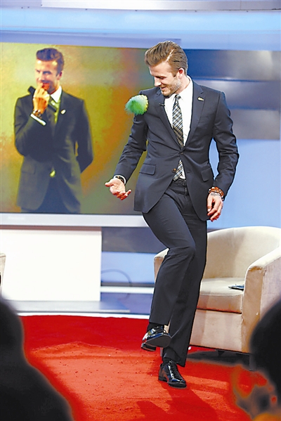 3月21日,贝克汉姆在做客央视《足球之夜》节目时,踢毽子大秀球技。CFP供图