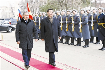 3月23日,国家主席、中央军委主席习近平在莫斯科参观俄罗斯国防部。这是习近平在俄罗斯国防部长绍伊古陪同下检阅三军仪仗队。