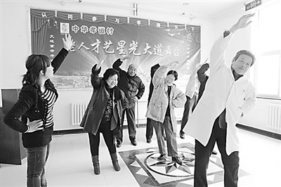 老人们在罗焰院长 ( 左一 ) 带领下做体操