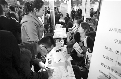 当日,2013宁夏银川“名企优才”暨高校毕业生专场招聘会在银川市体育馆举行。此次招聘会由银川市人力资源和社会保障局主办,是今年首场针对高校毕业生的专场招聘会,共吸引122家企业进场,提供岗位3520个,岗位涉及电子信息、建筑工程、培训教育、商贸金融等多个行业,当日进场求职的高校毕业生近5000人次。 李然 摄(新华社发)