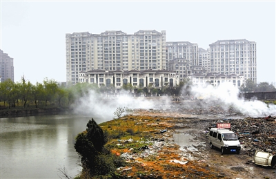 3月24日,工人在温州市中心一处正在拆迁的地块上清理。