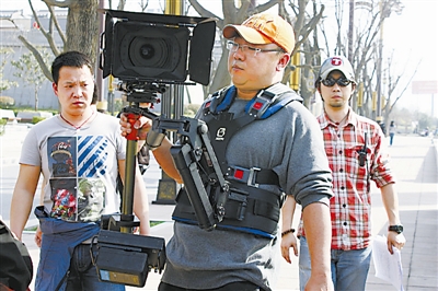 职工影视中心摄影团队的工作人员正在拍摄的路上 。