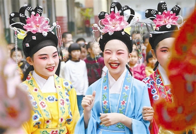 3月20日,福建省莆田市荔城区梅峰小学的几名小学生戏迷在排练莆仙戏。近年来,福建省莆田市的多所小学纷纷设立莆仙戏兴趣班、开设唱腔课、组建莆仙戏曲唱腔和表演兴趣小组,在丰富校园文化生活的同时,也使千年古戏得到了传承。始于唐、盛于明清的莆仙戏是福建特有的地方戏曲之一,被誉为宋元南戏的活化石,2006年入选首批国家级非物质文化遗产名录。新华社发 (林剑冰 摄)