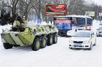 近日,强暴风雪袭击了乌克兰首都基辅,导致许多大型车辆受困于积雪的道路中。乌克兰军方紧急出动装甲车辆,协助救援部门将受困车辆拖出,确保道路畅通。图为装甲车正在将一辆趴窝的无轨电车拖离公路。谢涛 供图
