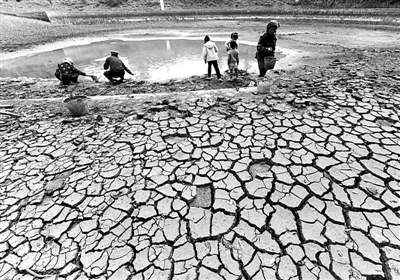 3月26日,云南省寻甸县功山镇朵马嘎村村民在即将枯竭的蓄水塘取水。