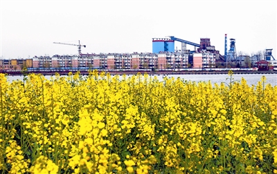 3月25日,位于安徽省淮北市烈山区国家矿山公园内,近处盛开的油菜花,中间的湖水和远处的楼房形成了一幅美丽的图画。