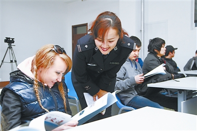 图为民警向留学生解读交通安全宣传内容的情形。
