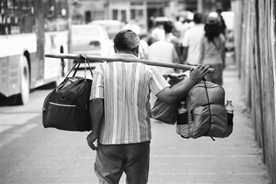 图为2月5日,北京街头一位“银发”打工者挑着自己的行李。